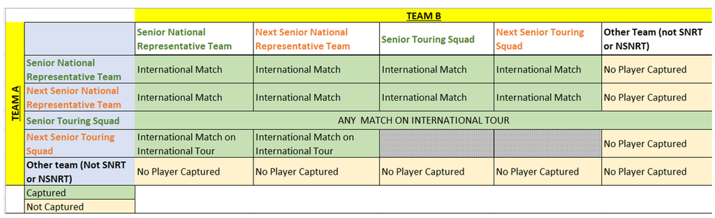 Example 2: Player 2 plays for the Senior National Representative Team against the Under 20s team of Union B. In this case, Team A is the Senior National Representative Team and Team B is neither the National Representative Team, Touring Squad or the NSNRT or Next Senior Touring Squad. Therefore, Team B is “Other Team”. The intersection point in this case reads “No Player Captured”. Therefore, a Player has not been captured in that match.