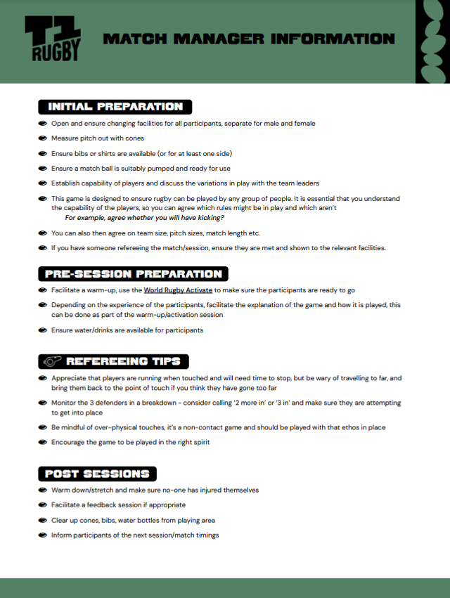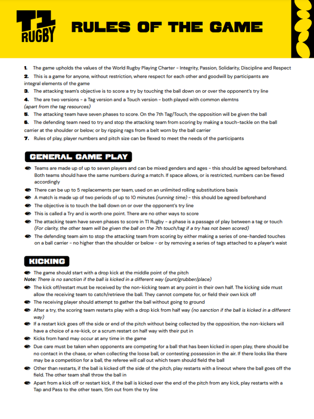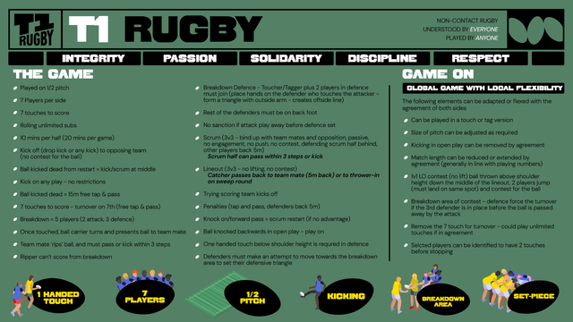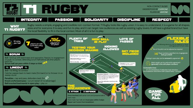 Why T1 Rugby? Rugby needs a simple, engaging and credible non-contact format. T1 Rugby looks like rugby union; its is easy to understand, it is a game for all shapes, sizes and for everyone.
