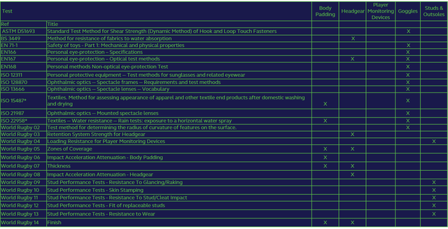 World Rugby use a combination of internationally accepted standards (ISO, EN, ASTM, etc) and specific internally developed tests. These internal methods are only developed if no suitable standard already exists. World Rugby Accredited Test Houses must hold ISO 17025 accreditation for the test methods used to assess equipment against Regulation 12. World Rugby has divided the tests into three categories based on the likelihood and ability to include these in ISO 17025 accreditation: