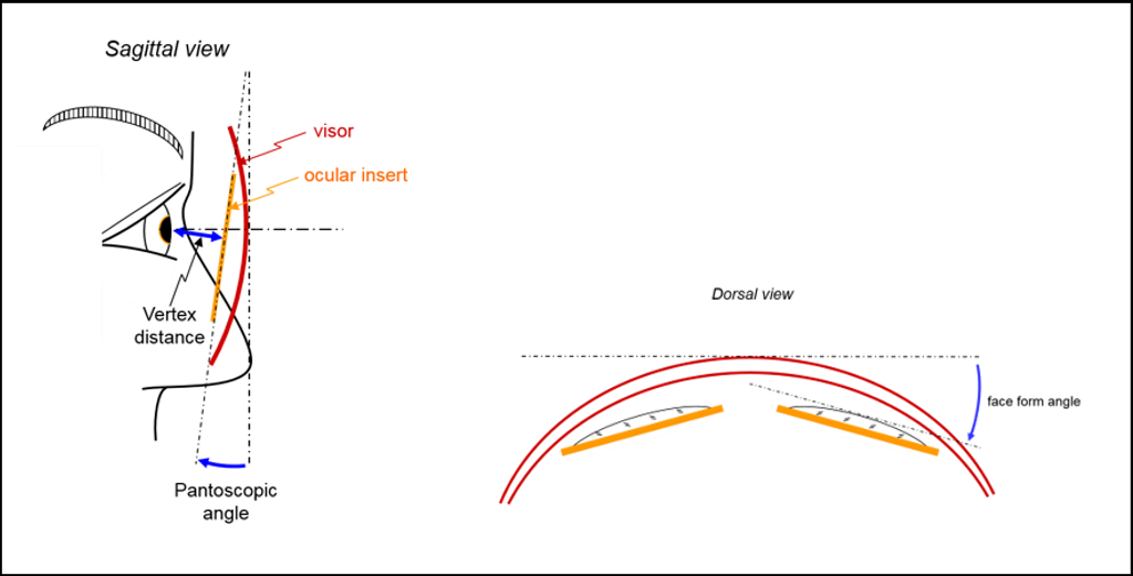 “The curvature of the goggle necessitates a larger than typical face-form angle for ophthalmic prescriptions. This may require prescription compensation to minimise potential prismatic effect, and off-axis errors for high ametropic prescriptions. The vertex distance is stipulated at a maximum of 15mm for the test head-form, but it is recognised that the ECP will have to facilitate an individual’s measurements.”