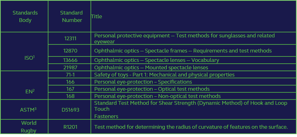 - ISO 12870: Ophthalmic Optics. Spectacle frames. Requirements and test methods