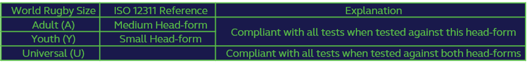 Table 2 below indicates the sizing nomenclature that shall be used by manufacturers on World Rugby approved devices.