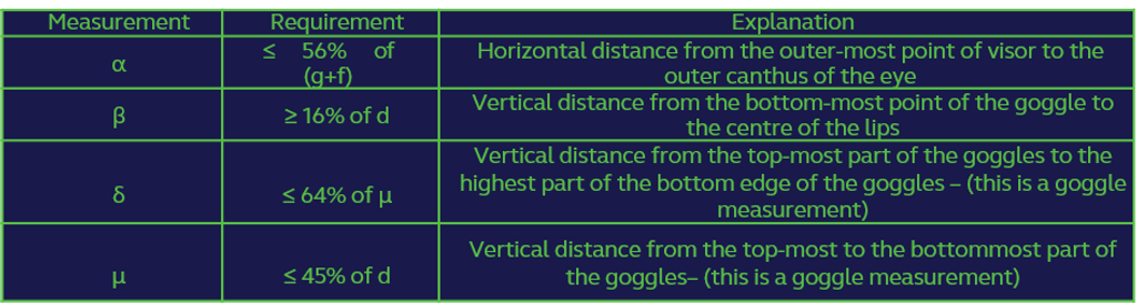The goggles should be just large enough to achieve the optical performance required of them. The requirements listed in Table 1 (with dimension references from Figure 1) shall be met by the goggles using whichever head form (see Section 6) the goggles have been designated to be assessed against. Measurements α and β shall be taken when the goggles are positioned so that the centre of both eyes is located at a point µ/2mm (±2mm) from the uppermost part of the goggles and the horizontal centre of the goggles is l/2 (±2mm) from the centre of each eye. Distance references from Figure 1 shall be taken from EN 167[5] (Section 17) for the appropriate head form.